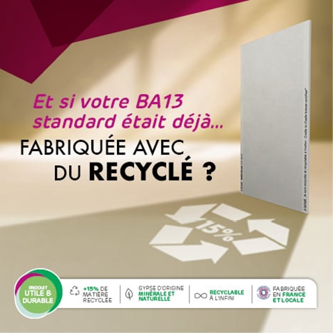 Et pour nos plaques PRÉGYPLAC STD BA13 et PRÉGYDRO BA13, fabriquées dans toutes nos usines, nous allons encore plus loin : elles contiennent 15 % de matière recyclée !