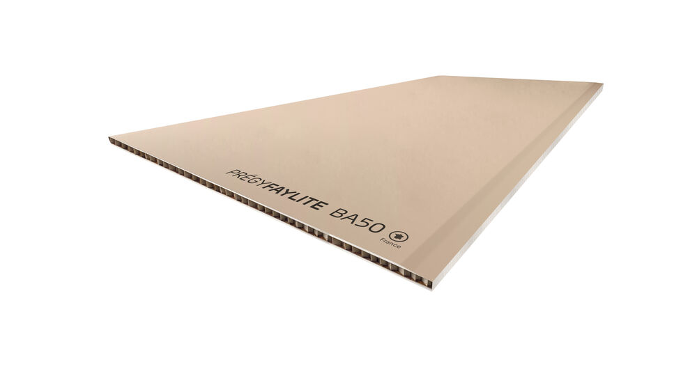 Panneau alvéolaire préfabriqué d'épaisseur 50 mm composé d'un réseau cartonné en nid d'abeille collé entre 2 plaques de plâtre PRÉGYPLAC Std BA10. Destiné à la réalisation de cloisons de distribution en neuf ou rénovation. Résistance au feu CF 1/4 h. Apte à recevoir tout type de finition et d'accrochage.