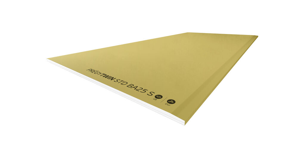 Solution de parois verticales avec des performances acoustiques élevées. PRÉGYTWIN Std BA25 S est un complexe composé de 2 plaques de plâtre spécialement formulées d'épaisseur 12,5 mm, collées entre elles en usine.