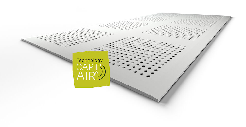 - Plafond pour correction acoustique, à joints non apparents de type PRÉGYMÉTAL constitué d'une plaque de plâtre perforée de la gamme Creabel : Creason.