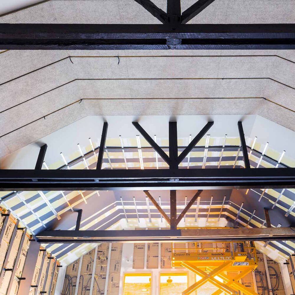 - Pour ce chantier un peu complexe au niveau des hauteurs et des charpentes existantes, nous avons préconisé les dalles plafond et mur, PUREBEL, innovantes et éco-responsables qui allient esthétique architecturale et performance acoustique, pour les espaces intérieurs des établissements recevant du public. En tant que membres du Club Pro Siniat, nous apprécions la performance de leurs produits, leur compétence technique et surtout leur disponibilité : par exemple, pour les appels d’offres, nous avons leur réponse dans la journée.