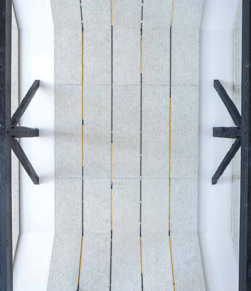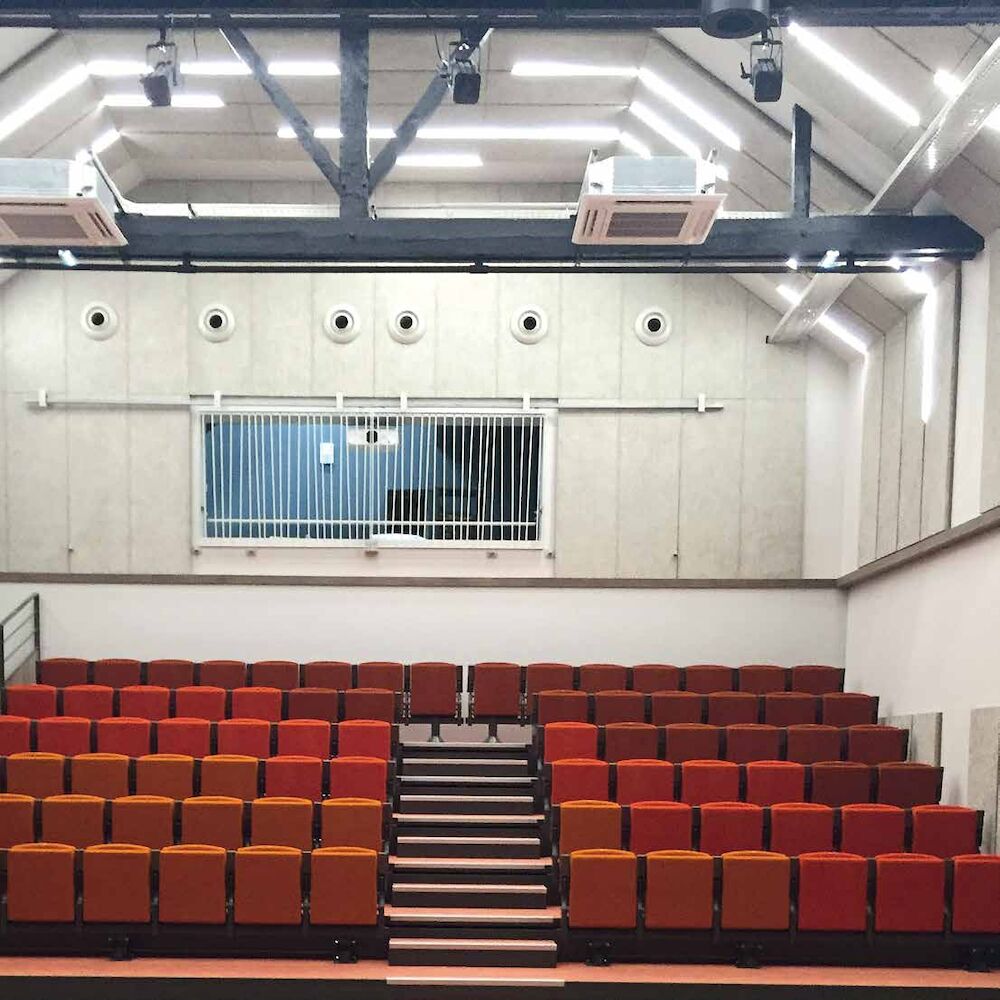 - Dans l’ancien Cinéma d’après-guerre, nous avons imaginé une solution pour optimiser le volume existant, distinguer les espaces « scène » et « salle » et traiter la polyvalence de l’acoustique. L’alliance des panneaux PUREBEL en deux tons et de tronçons Leds aléatoires confère au projet fonctionnalité, efficacité, clarté et poésie. Le tramage proposé, intégré à la structure du bâtiment, rythme ce lieu à vocation culturelle. Les gradins, les tentures velours, les ouvrages scéniques complets et le parquet en chêne s’accordent avec la précision de pose des panneaux pour une convivialité assurée dans un équipement performant.
