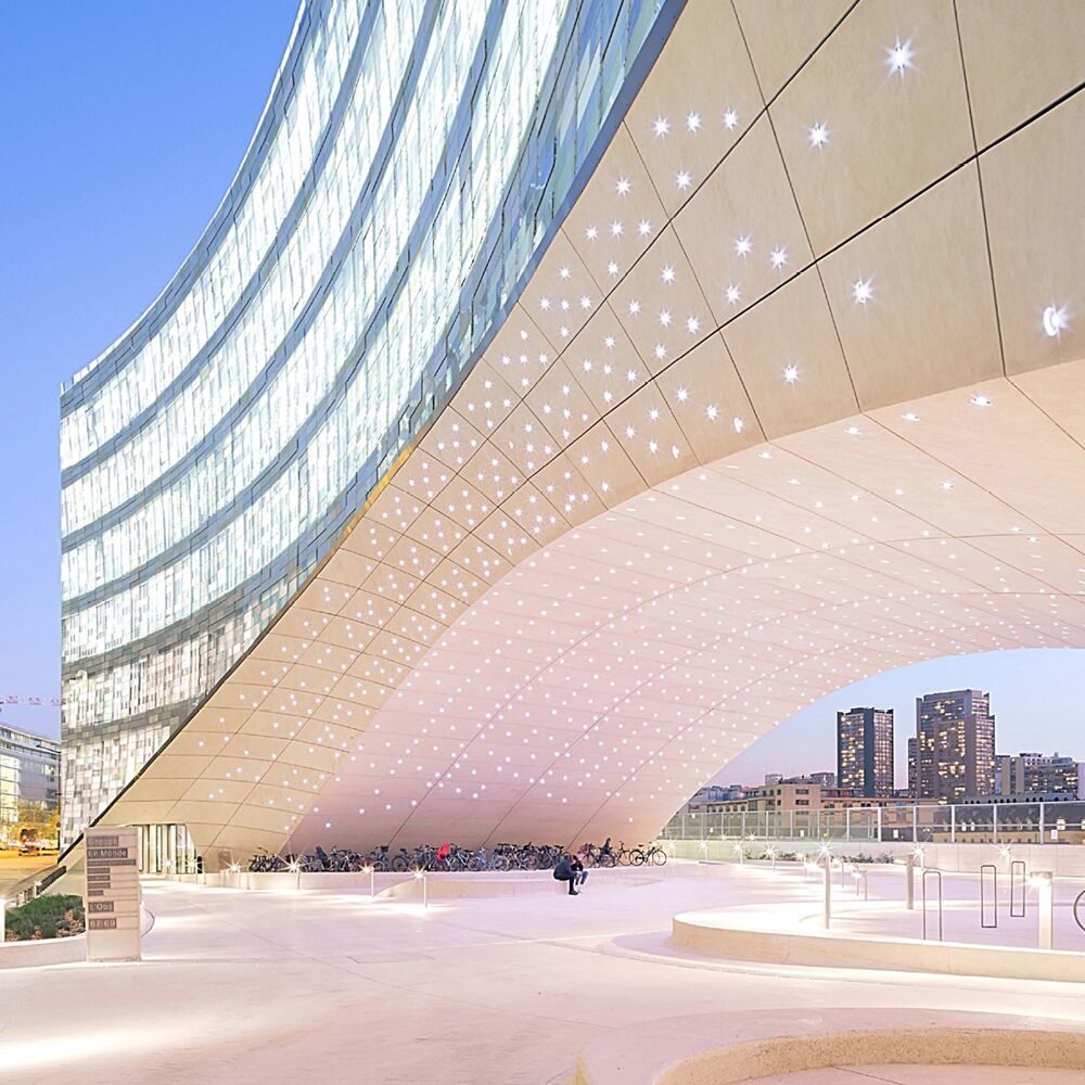Le nouveau siège du groupe Le Monde regroupe désormais ses 1 600 collaborateurs sur un même site de 23 000 m². Un « immeuble-pont » de 140 m de long duquel sont excavés des volumes sphériques ou coniques donnant leurs formes aux façades et à une arche d’une portée de 80 m surplombant un parvis. Il crée ainsi des liens avec le grand public et les transports en commun environnants en offrant une escale généreuse dans Paris.